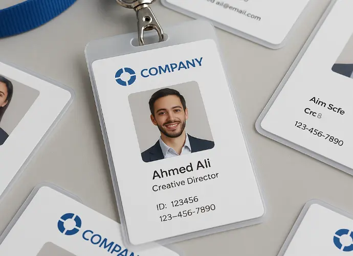 تصميم وتنفيذ بطاقات تعريف الموظفين والـ ID Cards بأناقة ووضوح تعكس هوية المؤسسة وتزيد من احترافيتها.